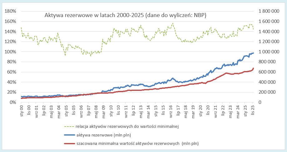 Na załączonym wykresie naniosłem wartość naszych rezerw dewizowych na wartość minimalną wymaganą. Przy czym przy doborze i przyjmowaniu wskaźników minimalnych byłem dość konserwatywny. Ostatecznie wyszło mi, ze nasze rezerwy są nawet o ok. 1/3 powyżej poziomu bezpiecznego. Całkiem niedawno prof. Kołodko podawał 1/4 . Podpisałbym się pod tym. Przy moich ‘eksperckich’ szacunkach to jakieś 300 mld pln, a w przypadku prof. Kołodki ponad 240 mld zł dla wartości na koniec 2025 r.
